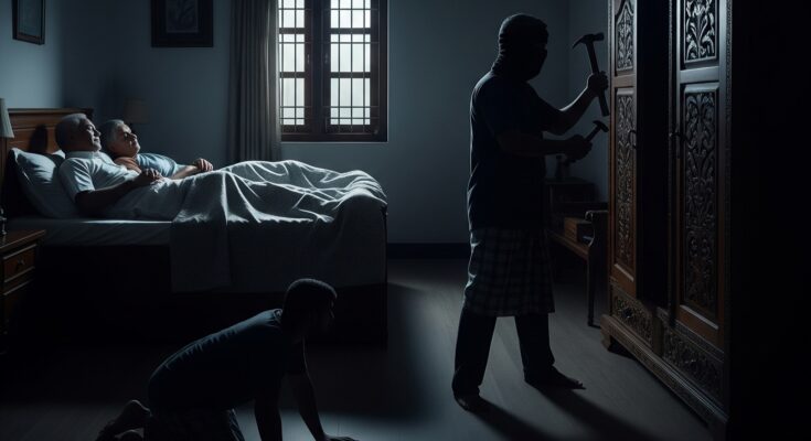 മുറിയുടെ വാതിൽപ്പാളി പതിയെ തള്ളി നോക്കി. പൂട്ടിയിട്ടില്ല. മുറിക്കുള്ളിൽ എ സി യുടെ ശബ്ദവും കൂർക്കംവലിയുടെ ഒച്ചയും കേൾക്കുന്നു. ശബ്ദമുണ്ടാക്കാതെ നിലത്തിരുന്ന്ഇ ഴഞ്ഞതിനുള്ളിലേയ്ക്ക് കയറി. മാഷും ടീച്ചറും കട്ടിലിൽ ഉറങ്ങുന്നുണ്ട്.’കട്ടിലിനരികിലാണ് വലിയൊരു അലമാരയുള്ളത്. പണം അതിനുള്ളിലായിരിക്കും.’.മാഷ് ചെറുതായി കൂർക്കംവലിക്കുന്നുണ്ട്. ടീച്ചർ ശാന്തമായുറക്കത്തിലാണ്.